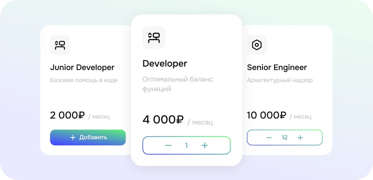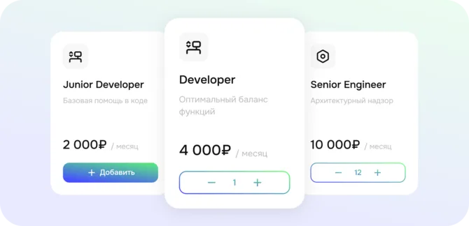 Подберите специалиста под вашу задачу: Мини для быстрых задач и шаблонов, Про для разработки фич, Про Макс для более сложных проектов и Дизайнер на уровне лучших практик веб-дизайна.