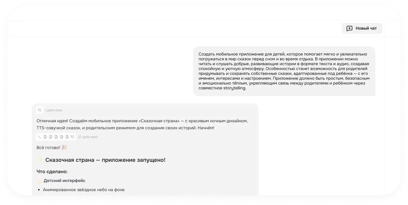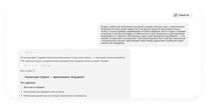 Это ИИ‑сервис, который создаёт сайты, сервисы, чат‑боты, трекеры и другие продукты по вашим запросам. Теперь реализовать цифровое решение — это просто объяснить сервису в диалоге, что вам нужно, как если бы вы давали ТЗ разработчику. Но вместо недель ожидания вы получаете готовый результат через пару минут.